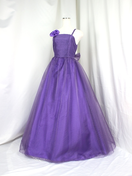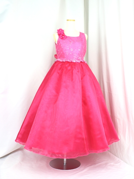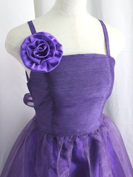身ごろはレース、スカートはオーガン。 右肩はキャミソール、左肩はノースリーブになっています。右肩のお花は安全ピンどめで取り外しできます。写真撮影には別途パニエを使用しております。このドレスは即納できます。お胸周り84cm おなか周り76cm みごろ丈38cm 総丈138cm。
