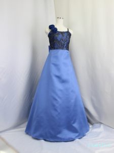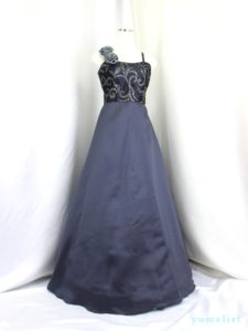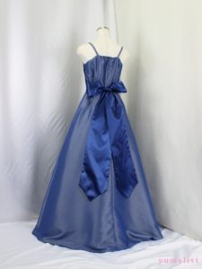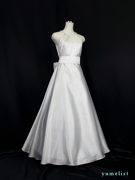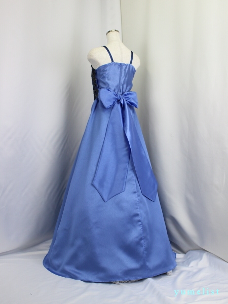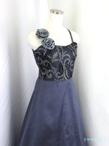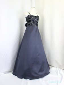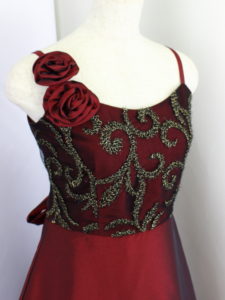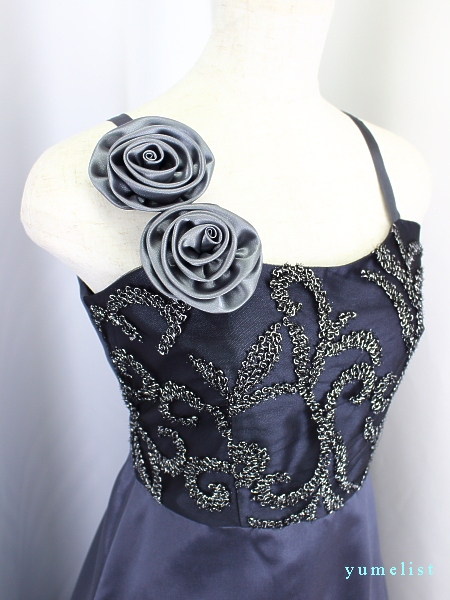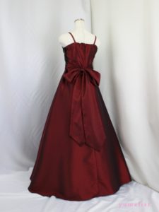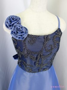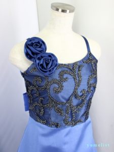 身ごろは金糸の刺繍レース、スカートとバックリボンはタフタ地、肩ひもの幅は1cm程度